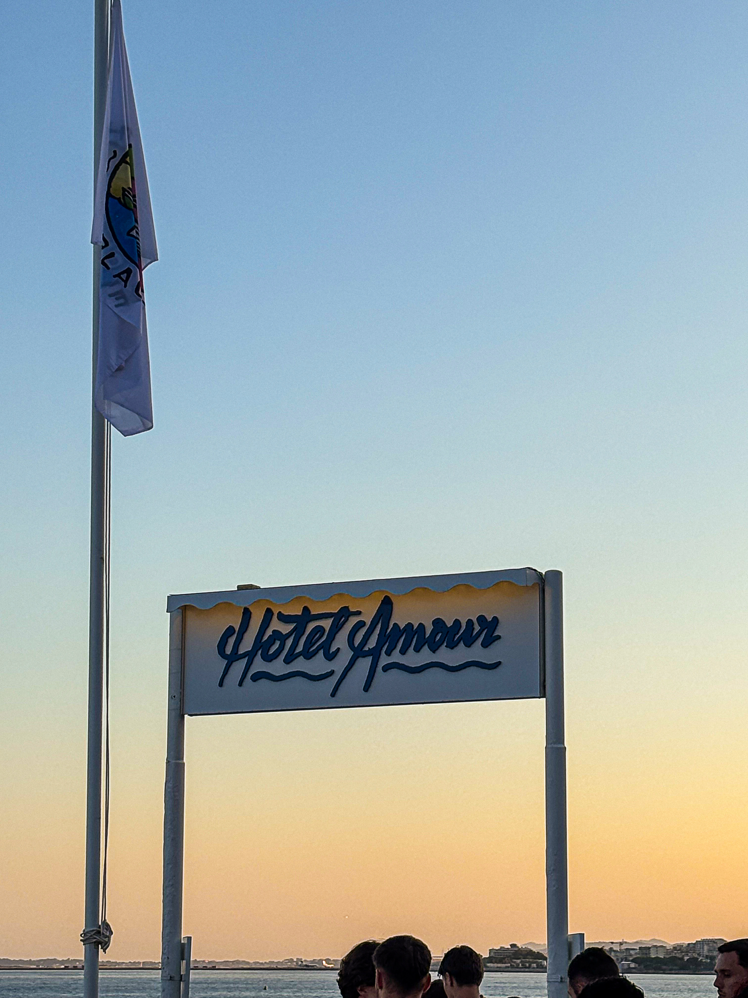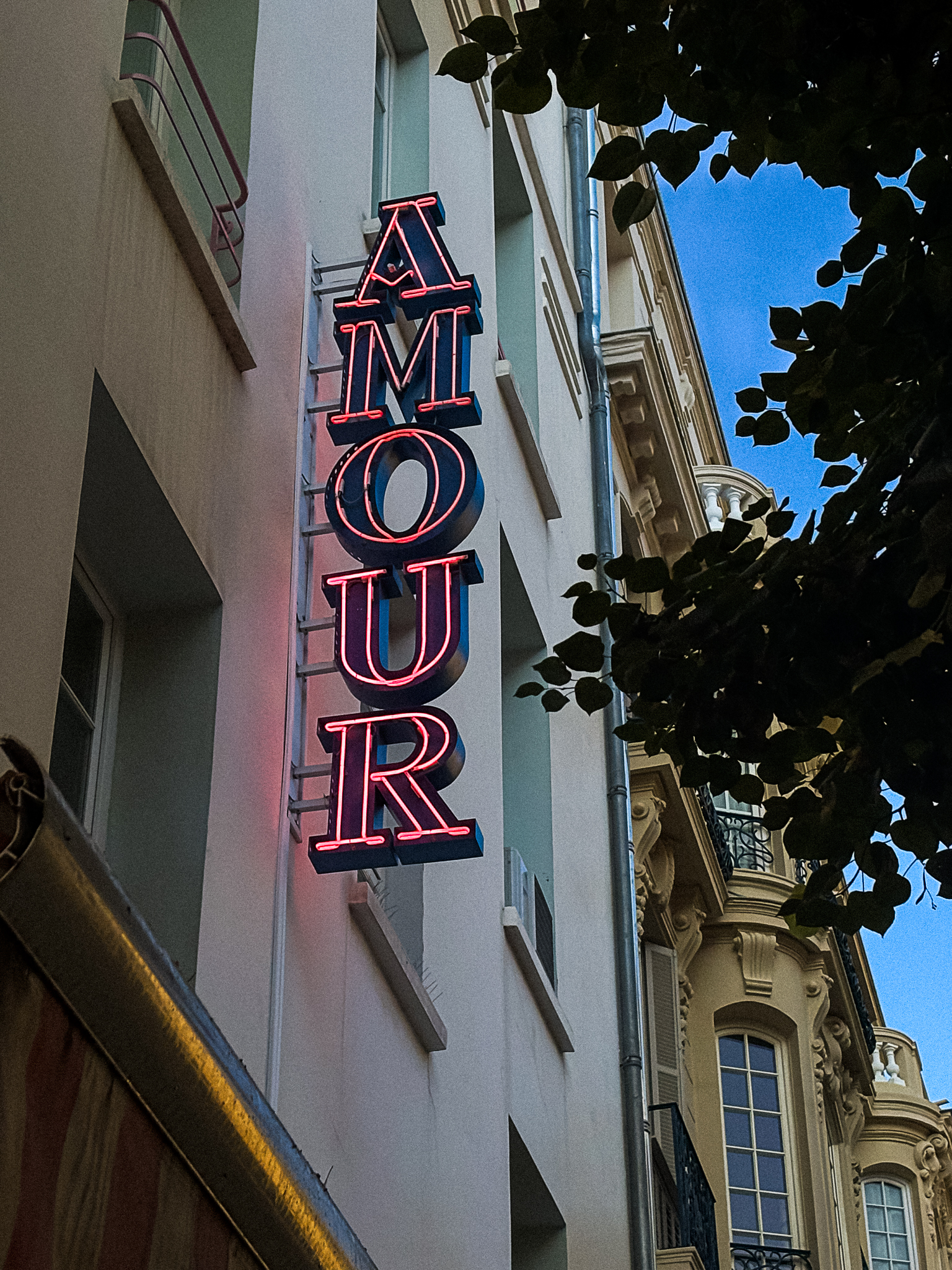 Façade de l’Hôtel Amour à Nice avec auvent rayé rose et enseigne néon