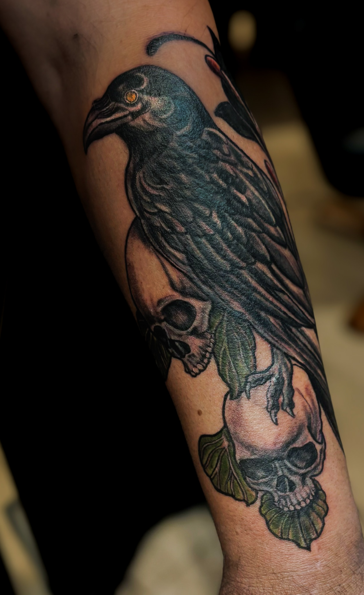 Tatouage art nouveau en couleur — paon et motifs floraux | Tamara Chaudesaigues