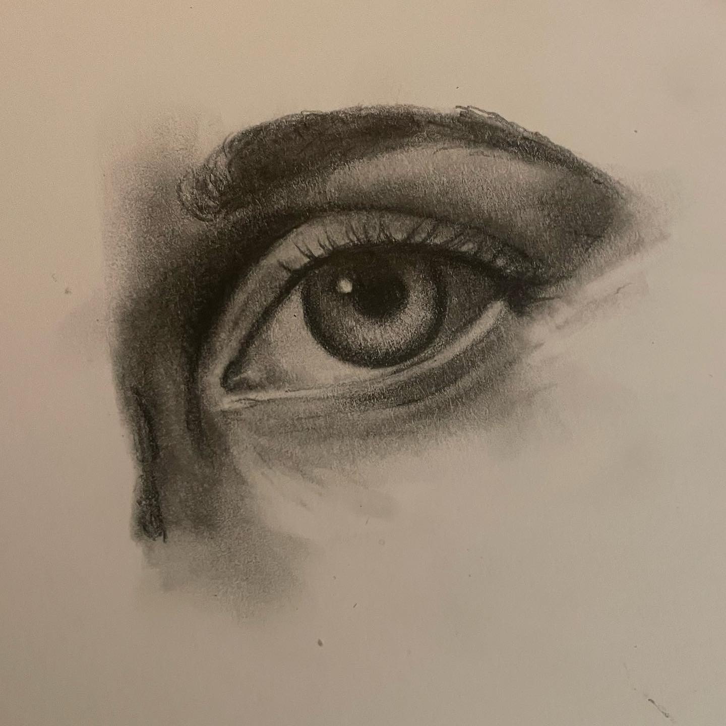 Étude d’un œil humain dessinée au crayon à papier. Travail du regard, des valeurs et des volumes, réalisé par Tamara Chaudesaigues, tatoueuse et dessinatrice à Avignon.