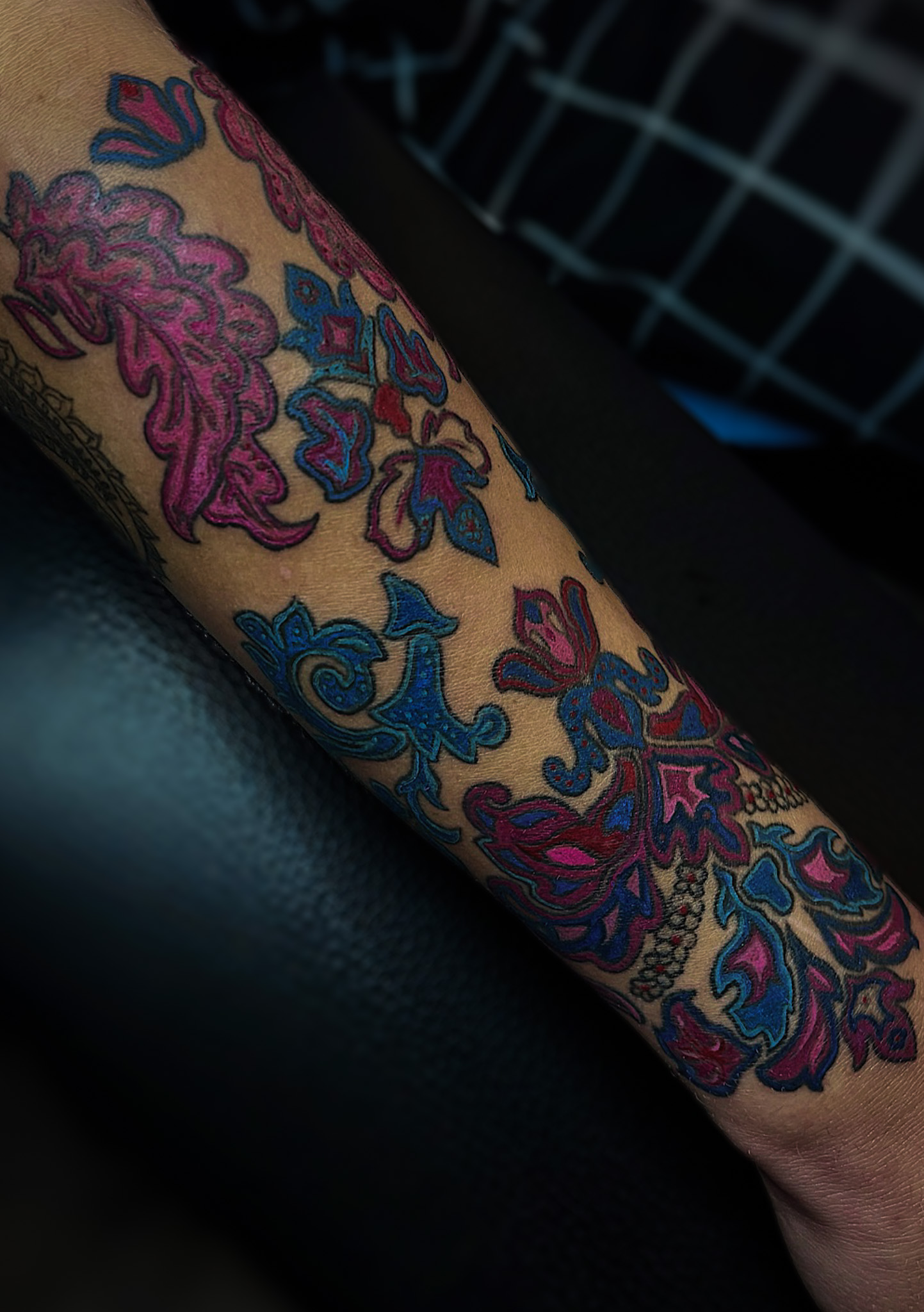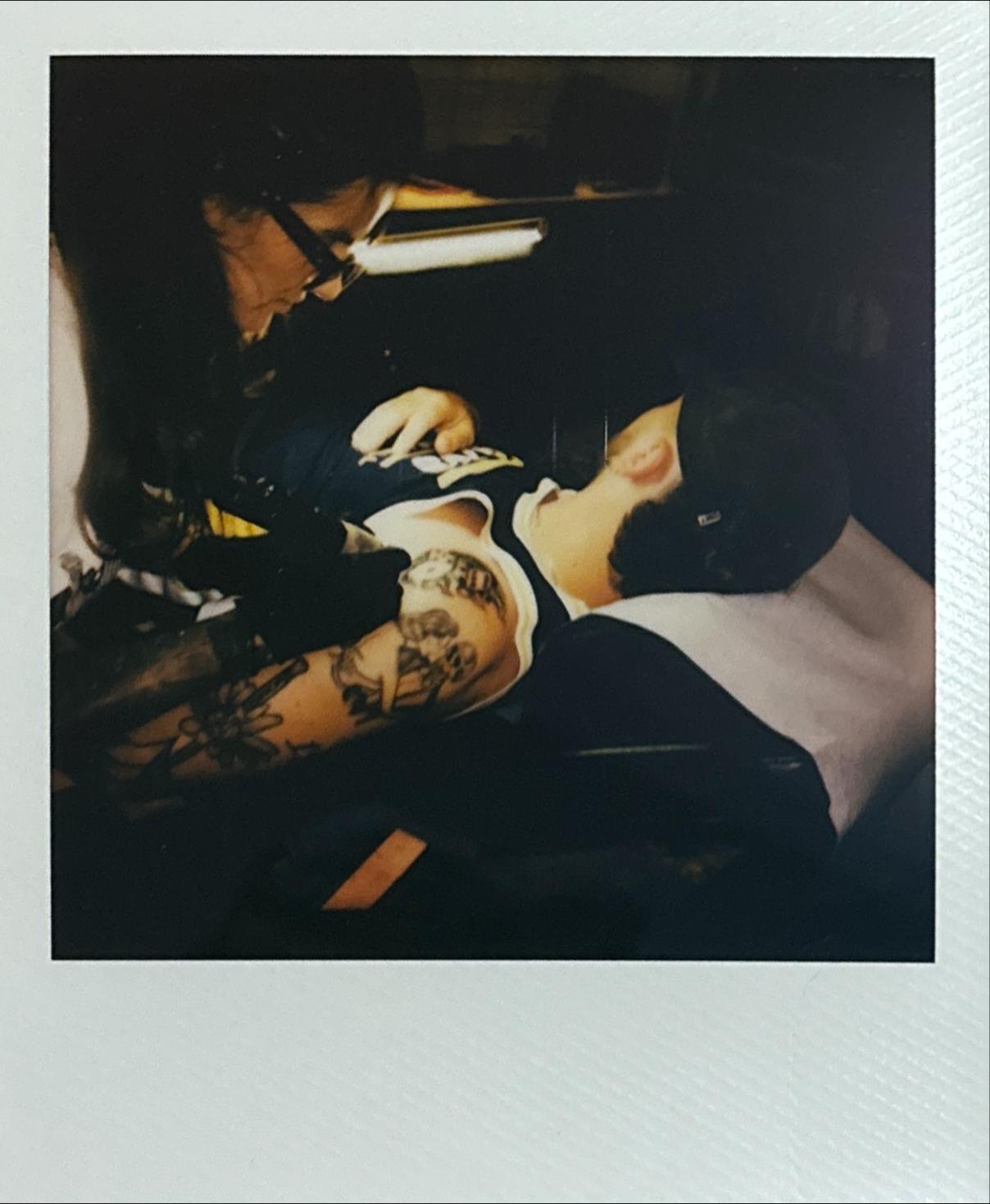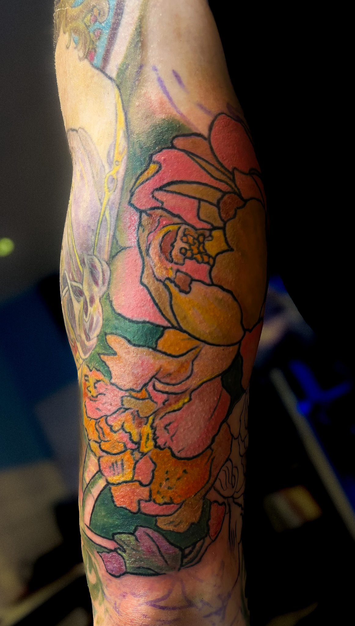 Bras inspiré de Tamara de Lempicka, en cours de tatouage.