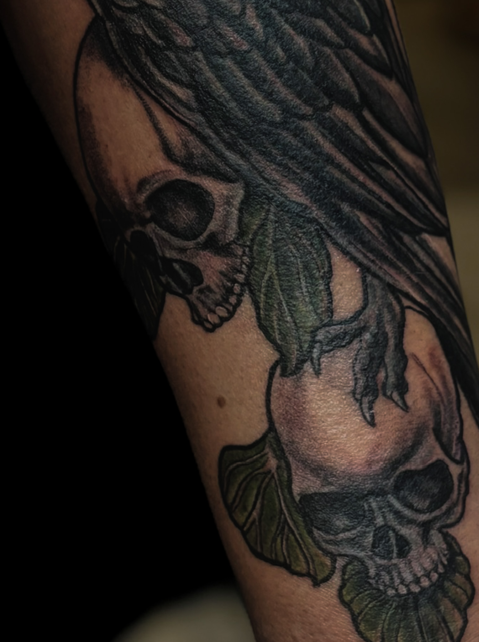 Tatouage crâne noir et gris, inspiration Art nouveau