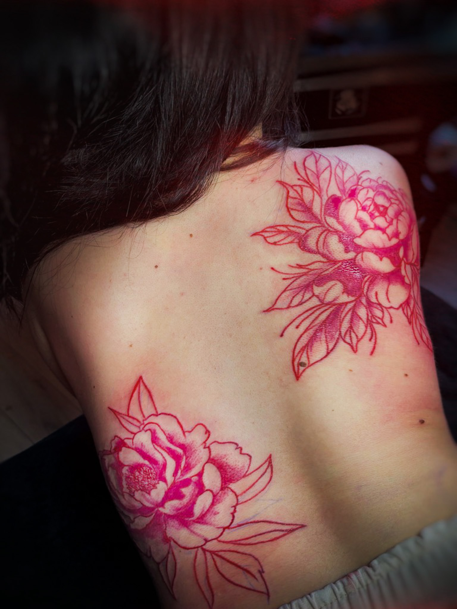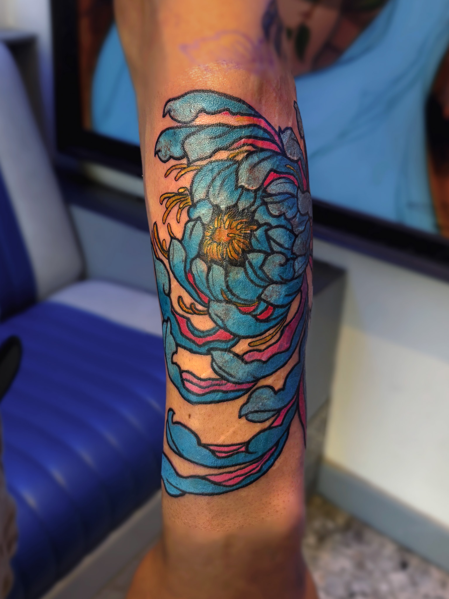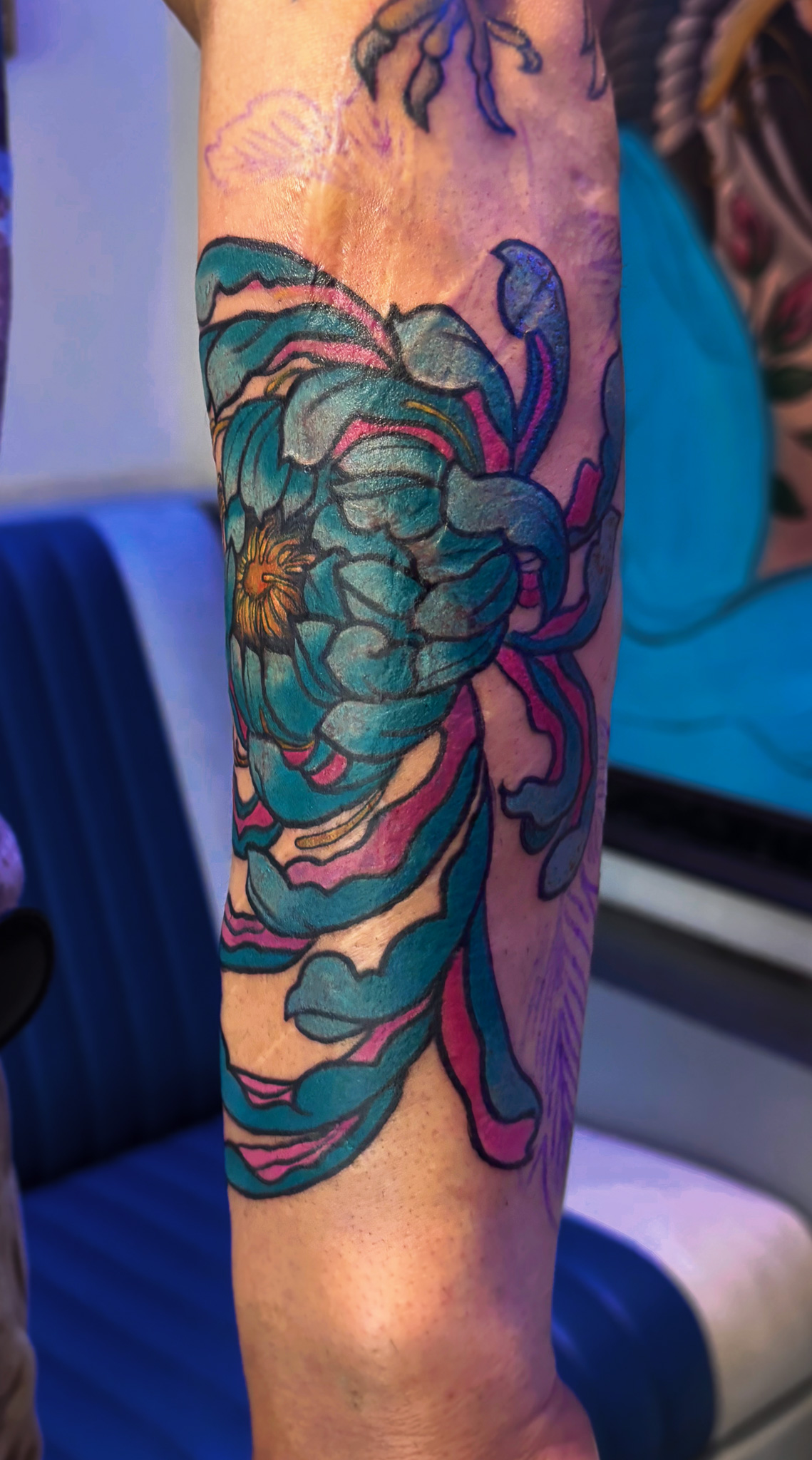 Recouvrement de cicatrice par tatouage floral – chrysanthème – Tamara Chaudesaigues
