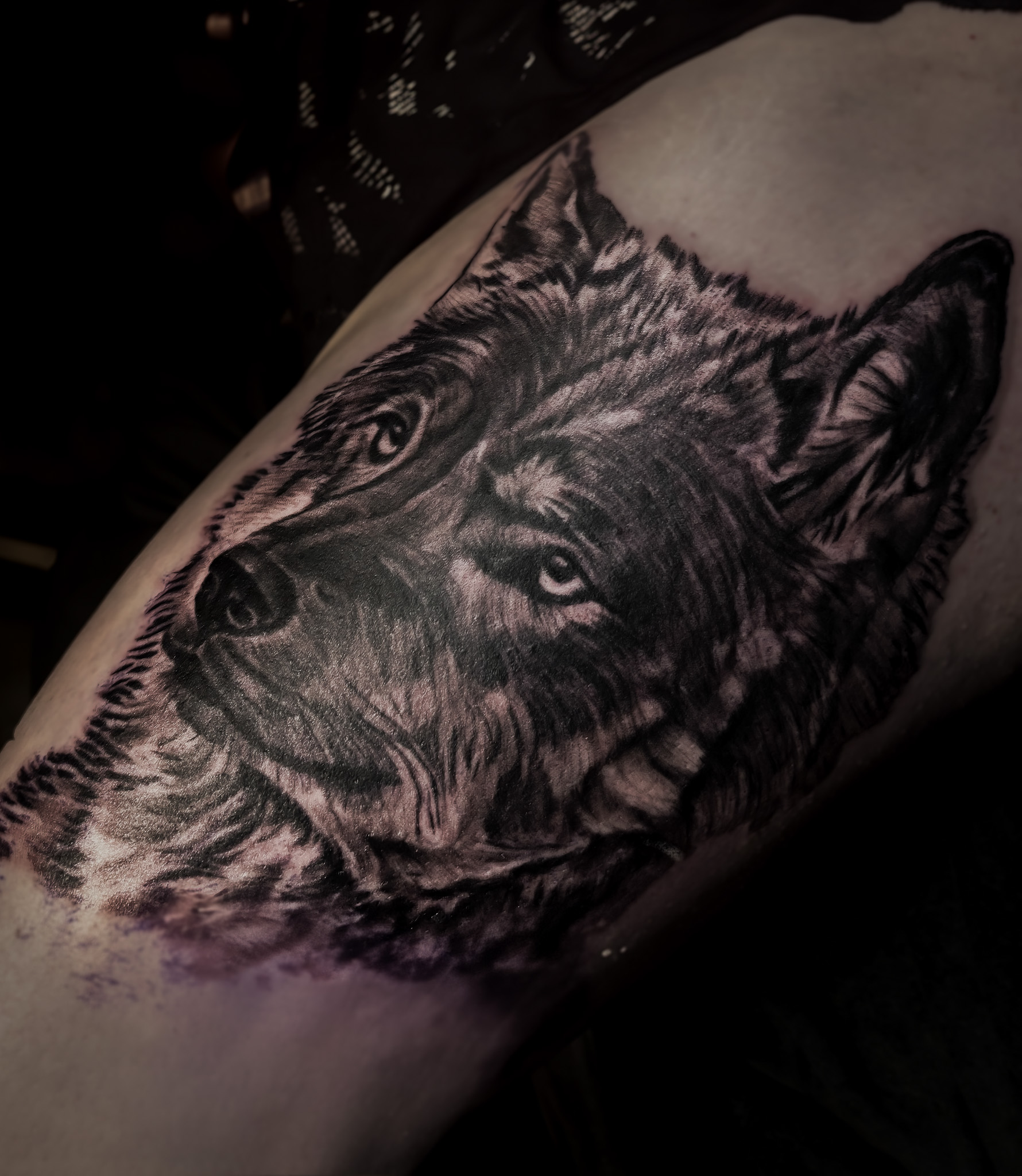 Tatouage loup en noir et gris — portrait animalier | Tamara Chaudesaigues