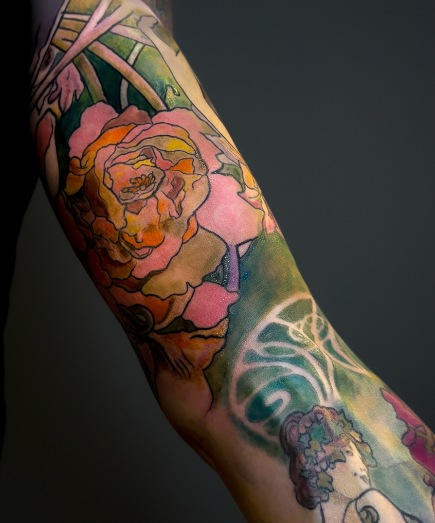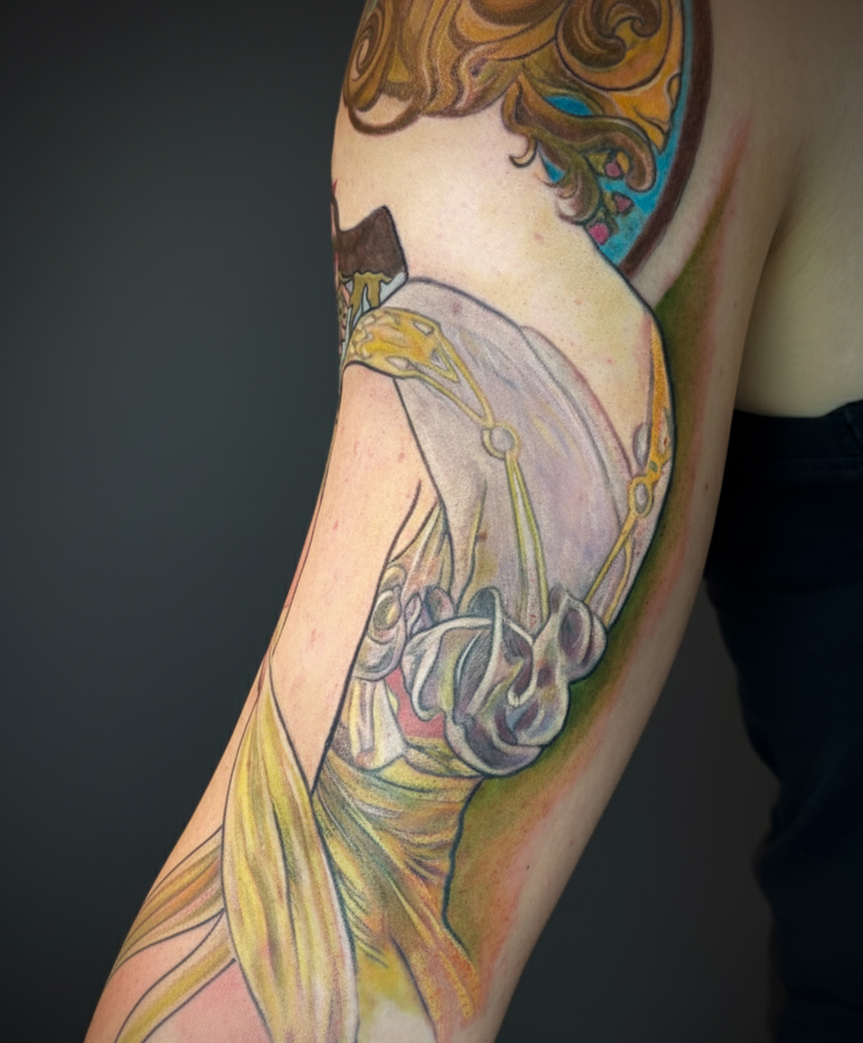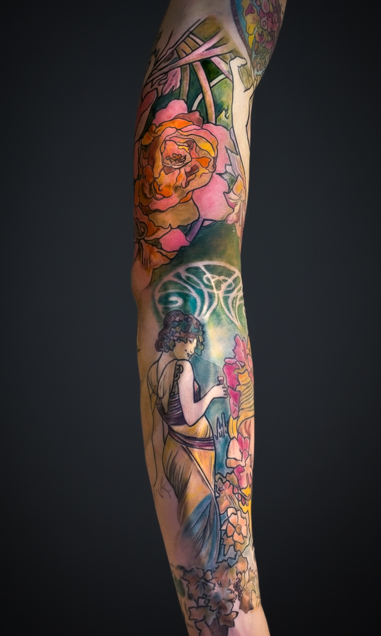 Tatouage bras art nouveau en couleur — inspiration Alphonse Mucha | Tamara Chaudesaigues