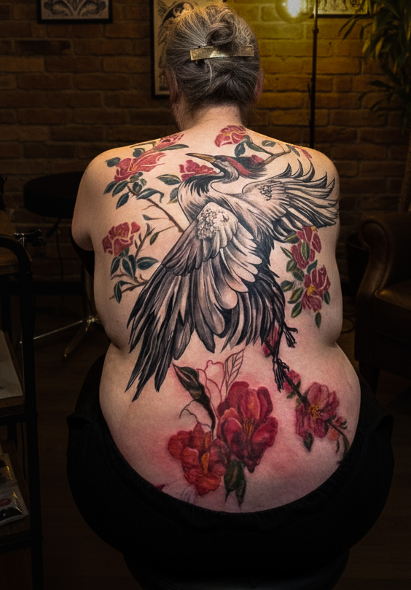 grue-japonaise-tatouage-dos-couleur-art-nouveau-avignon-tamara-chaudesaigues